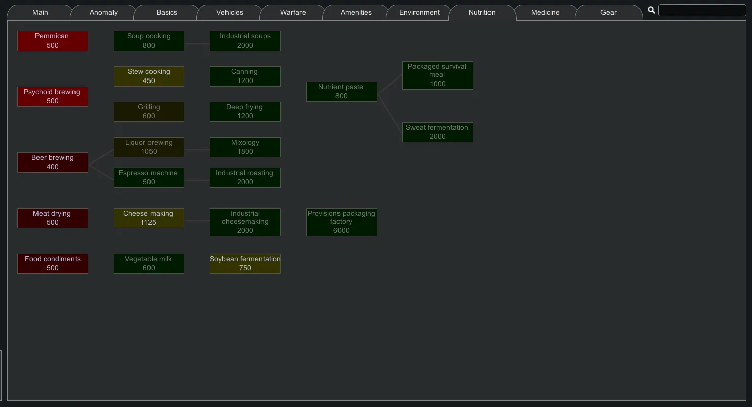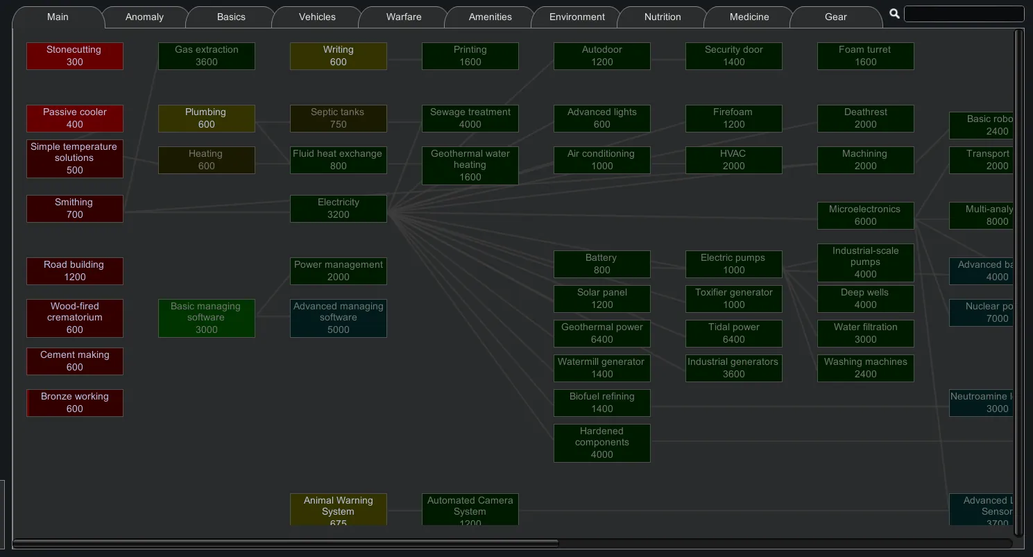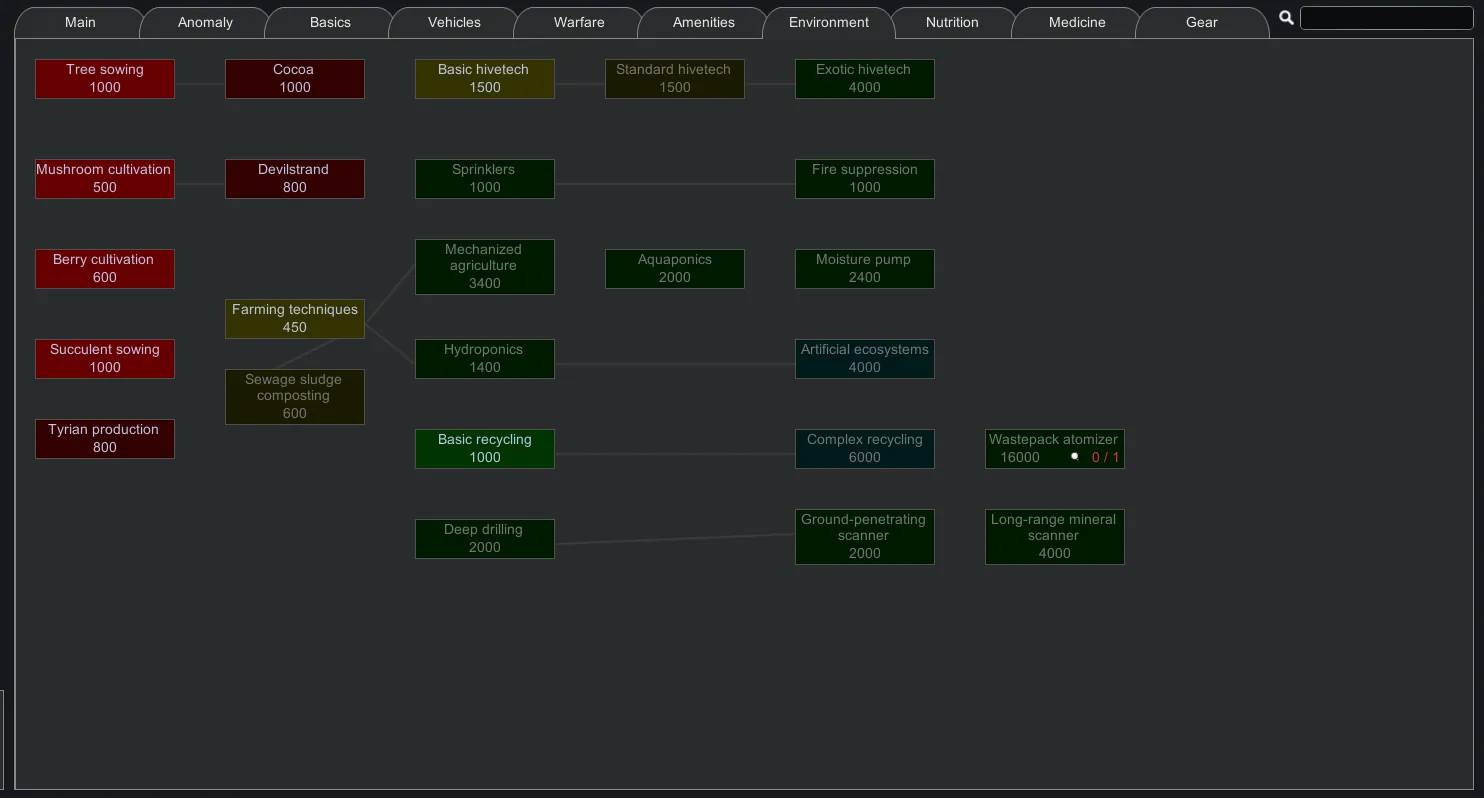 This mod reorganizes the tech tree to make it easier to navigate by grouping technologies by theme instead of by mod. It includes support for a many mods, including the entire Vanilla Expanded collection and Ferny's Progression mods. All included mods are optional, you can check the supported mods on the pinned thread.