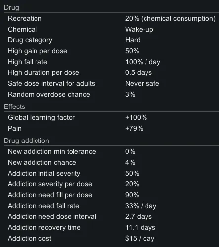 [b] Bad Effects: [/b] +79% Pain, 4% Wake-Up addiction, 3% Overdose, Random heart attack (same as Wake-Up)
