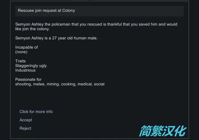 被营救者加入前申请同意:被营救的小人会无视你是否同意直接加入你的殖民地,这个mod增加了选项让你选择是否让其加入。