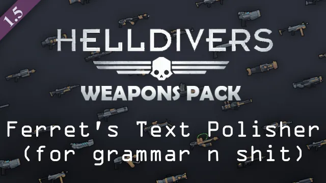 Fixes some of the missing spaces, grammar, etc in the Helldivers weapon pack. You don't get any funny about.xml. You had your funny about.xml in the last mod.