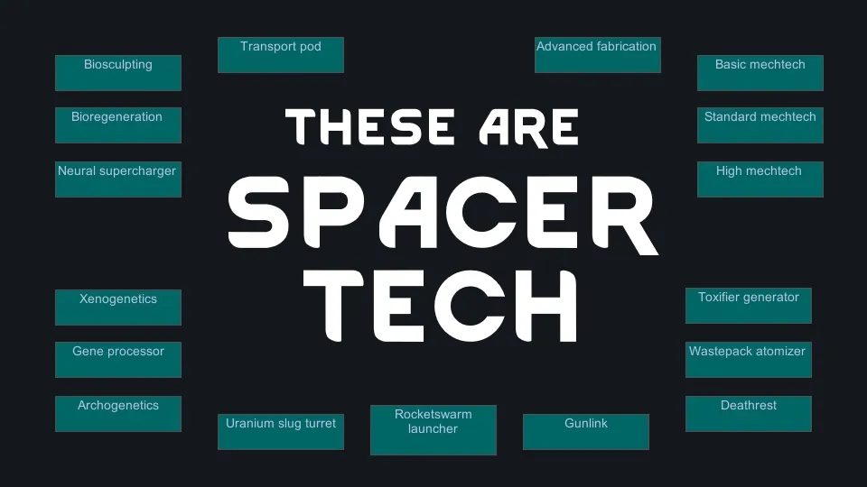 [*] [url=https://steamcommunity.com/sharedfiles/filedetails/?id=1264778930]Colonist Tech Background[/url], only pawns with understanding of Spacer tech will can research, craft, build, repair and fix Spacer tech stuffs (other pawns need to study first).