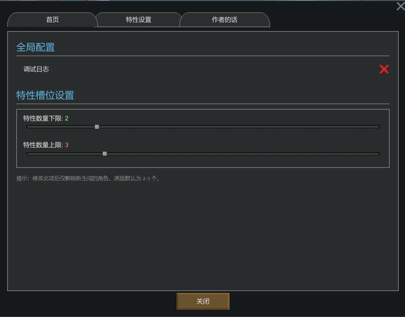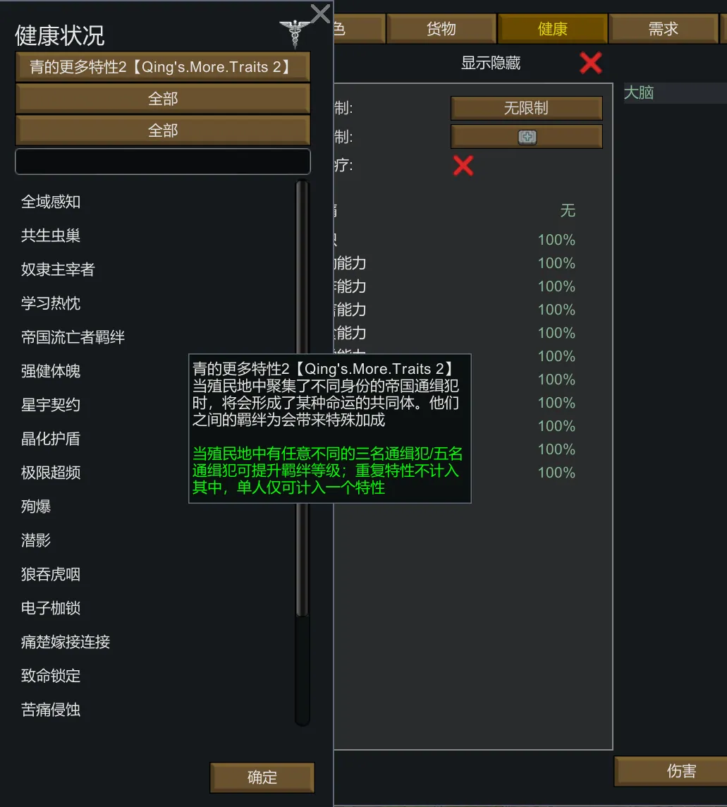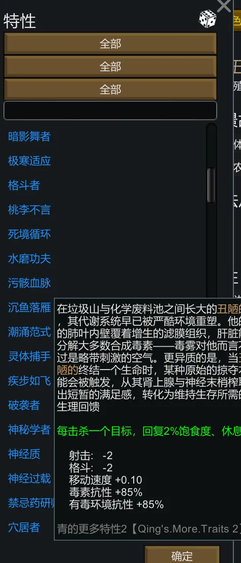 这本质上是一个由我个人参考了诸多特性mod后所创作的特性合集,以供我的个人游玩。由于我不太喜欢玩梗或是与出戏很明显的特性包,又觉得原版的特性比较少,所以这个特性包在摸索过一阵后终于出现了。不过这并不能符合所有人的胃口,请按照自己的需求添加