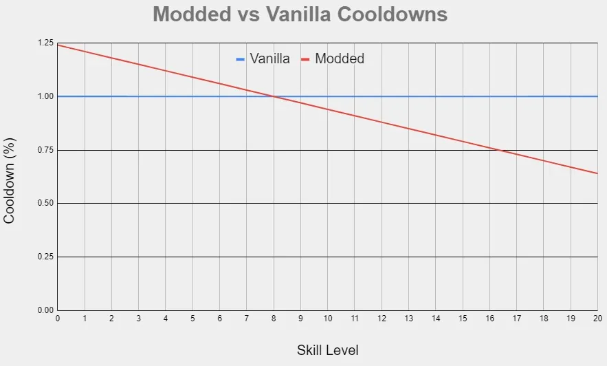 See graphs above for more details of how skill level affects cooldowns and how that translates into attack speed.