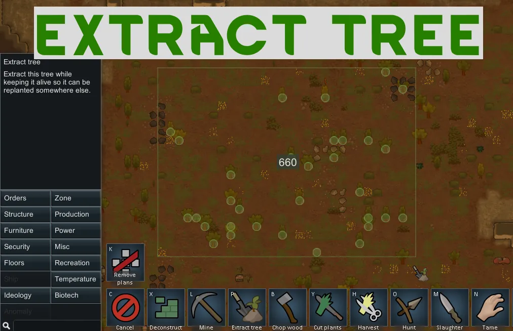 This mod adds a new "Extract Tree" option to the orders menu in RimWorld. With this feature, you can mark trees to be carefully dug up and moved to a new location instead of cutting them down.
