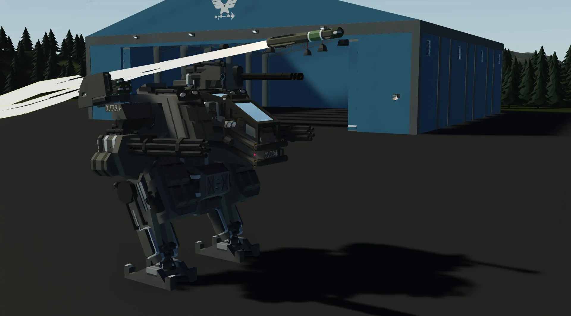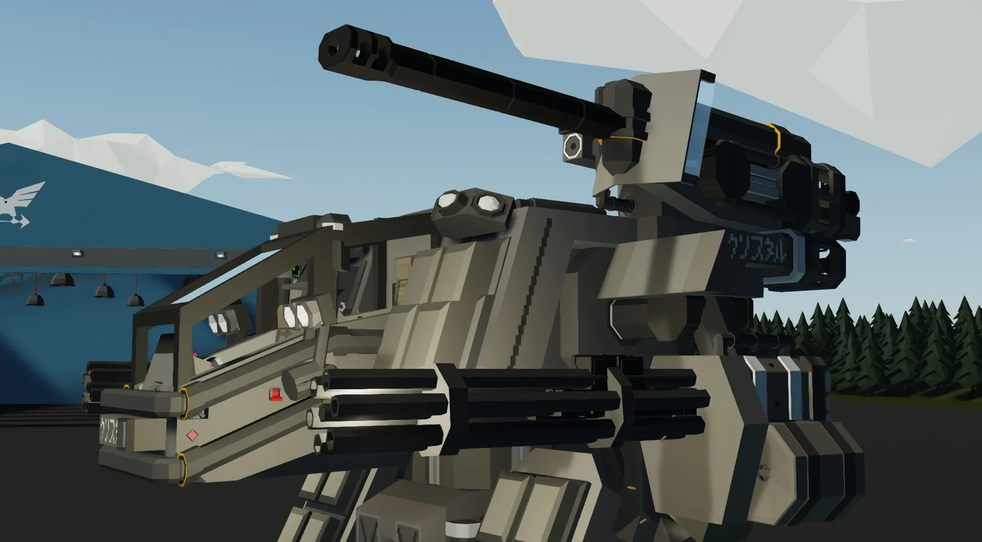 Armament includes twin 30mm rotary cannons for anti-infantry and light armor suppression, a six-cell ATGM rack for precision anti-armor strikes, and a massive 195mm siege cannon designed to obliterate hardened fortifications or heavy mechanized targets from extreme range.