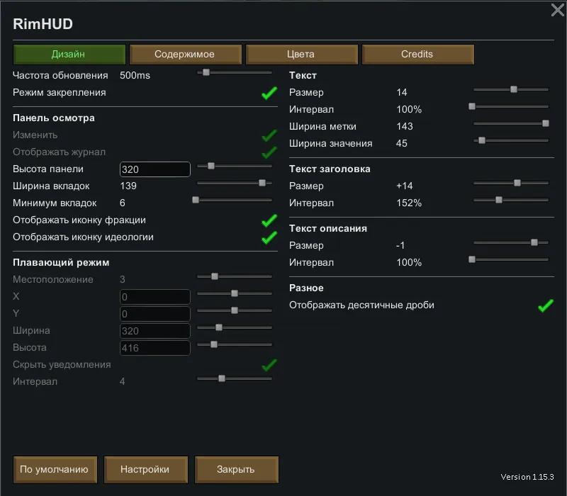 [url=https://steamcommunity.com/sharedfiles/filedetails/?id=1508850027]RimHUD[/url] - это мод пользовательского интерфейса, который отображает подробную информацию о выбранном персонаже или существе. Отображение HUD интегрировано в панель осмотра, размер которой можно изменять, чтобы вместить дополнительную информацию. Кроме того, HUD может отображаться в отдельном плавающем окне, которое можно прикрепить в любое место на экране.[/i]