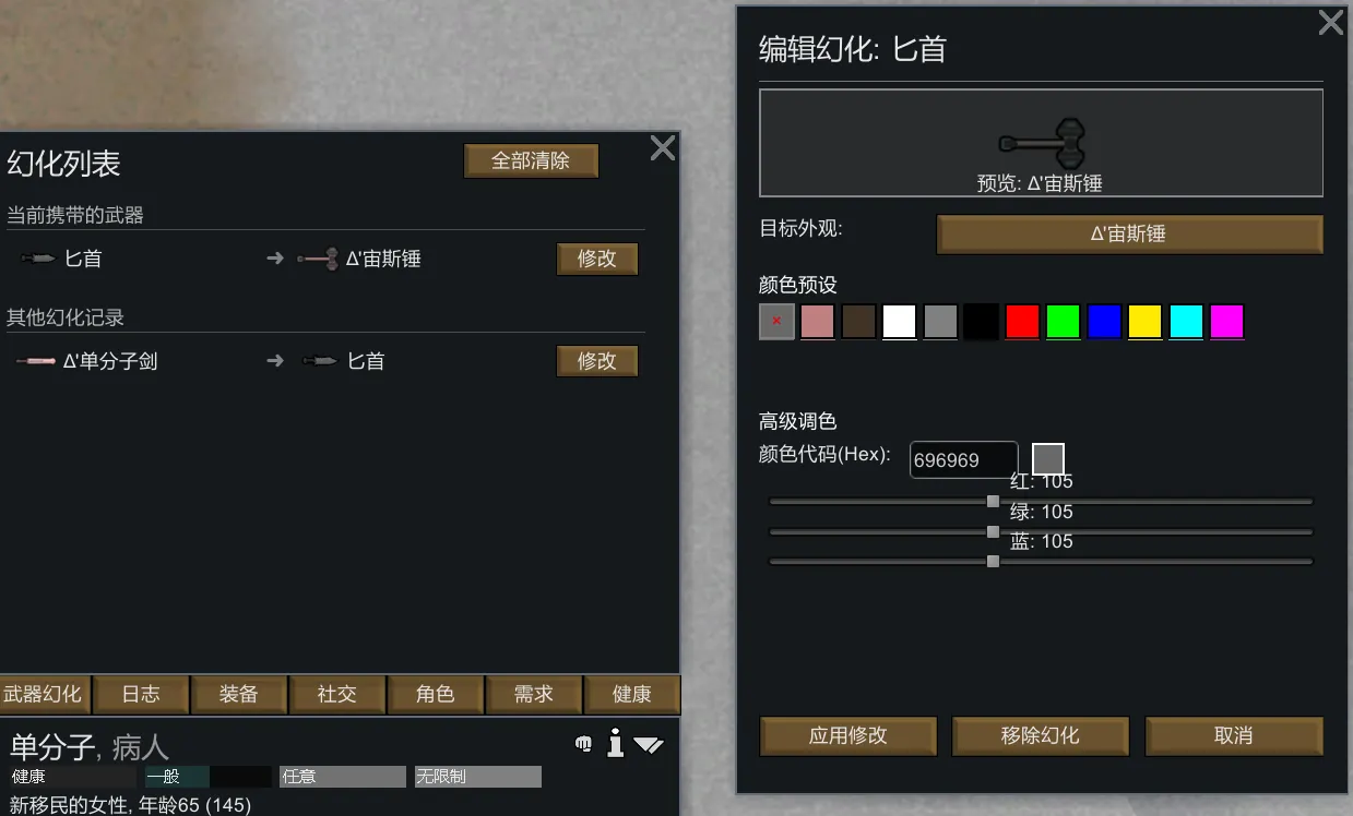 [*] [b]Weapon Dyeing System[/b]: Color-coordinate your weapons with outfits or signify ranks using custom tints. Use the integrated color sliders, hex code input, or quick presets within the modification interface to apply precise colors that are reflected in both the game world and UI icons.