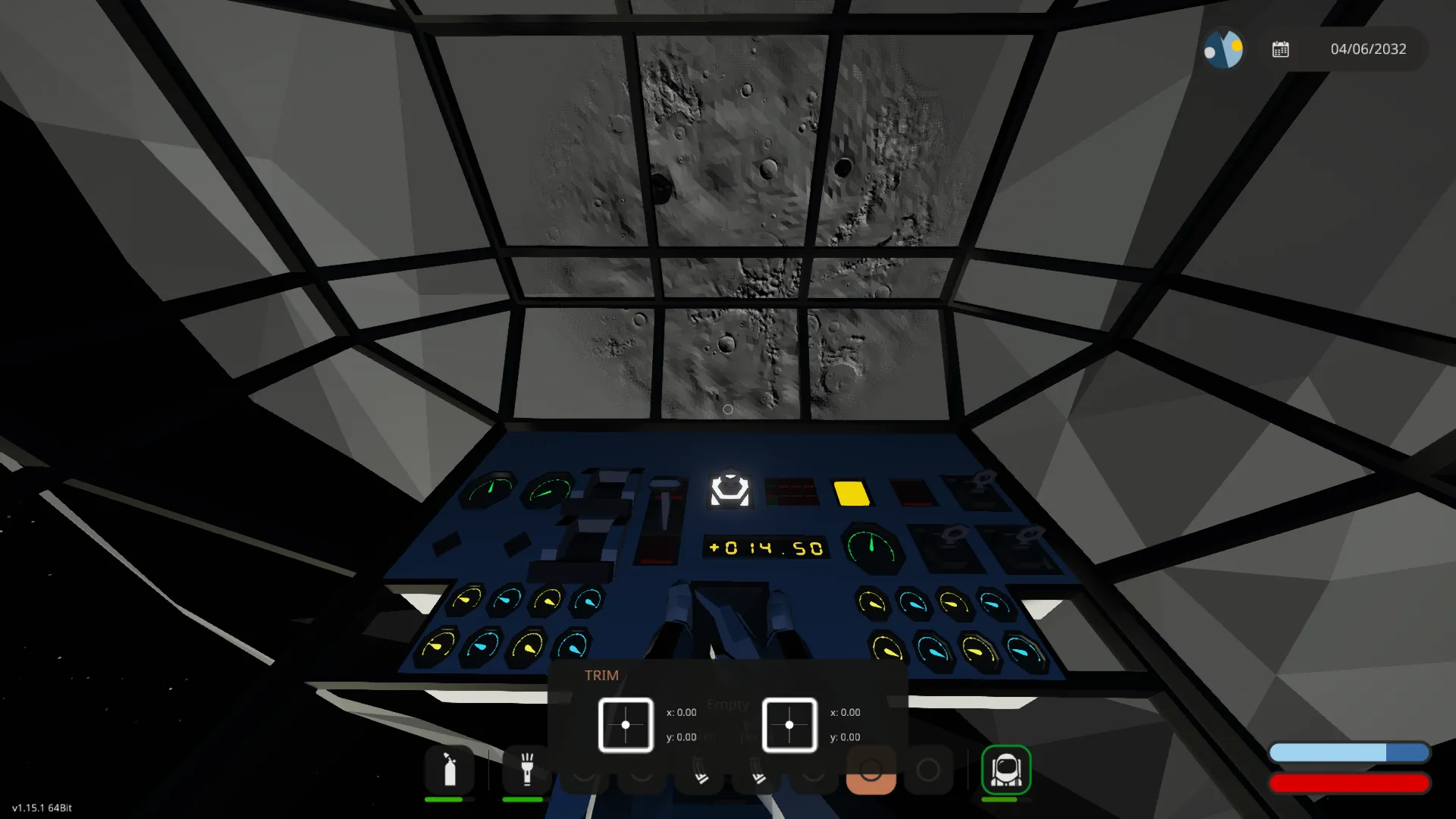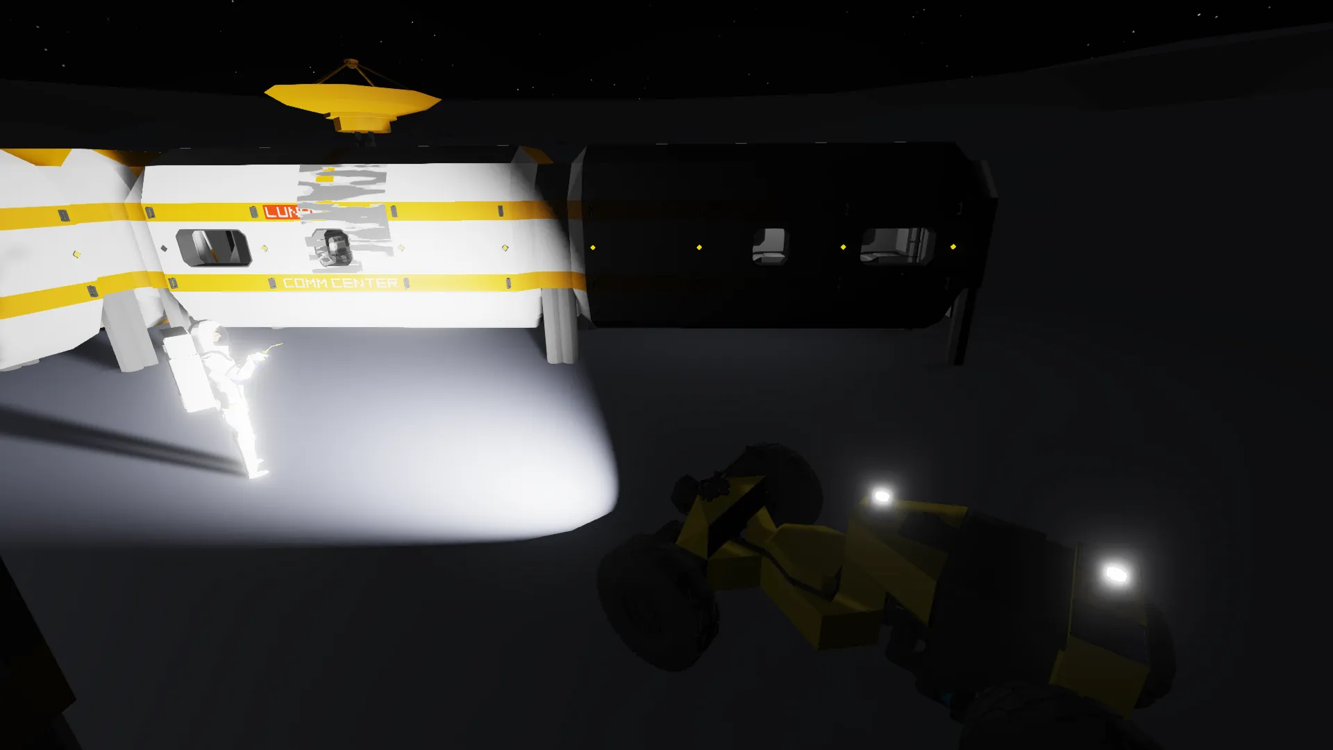 Keep acting on the above parameters. Ideally you would move with vertical speed below 10 and total speed below 3 times (30). Once on moon surface, you can detach and use the rover. Gas tanks are available to restore pressure inside, including pushbutton with motorized valves to equalize the airlock.