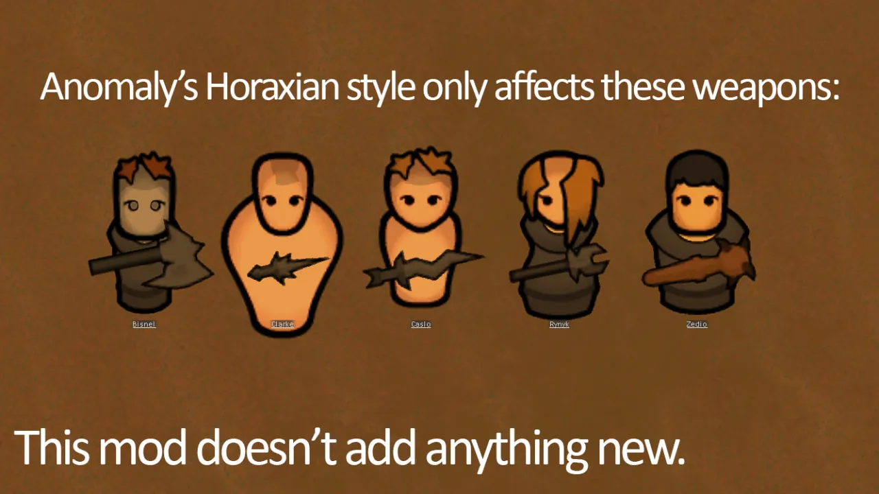 [b]The Horaxian style only affects:[/b] The Axe, Knife, Gladius, Mace and Club weapons. It features no unique ritual effects or music. [b]There are no plans to change that with this mod.[/b]