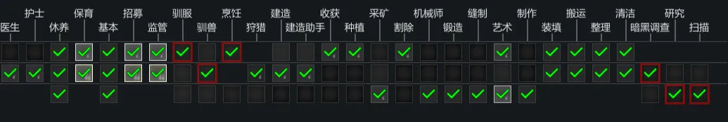 将工作分开 医生分为 治疗和照顾 驯兽分为 驯服和照料 监管分为 看守和招募 建造分为 建造和建造助手(搬运建造材料 维修 拆卸) 种植分为 收货和种植 将锻造中的机械师分离出来 搬运分为 设备装填 仓库物资收集 仓库整理 研究分为 研究和扫描 兼容 已兼容生物科技机械体 已兼容米粒拉机械体与无人机 旧存档的机械体要重置下工作模式 重置方式是 用创造模式将机械体改成地方单位 然后在改回我方单位 这样就行了 或者杀死后复活