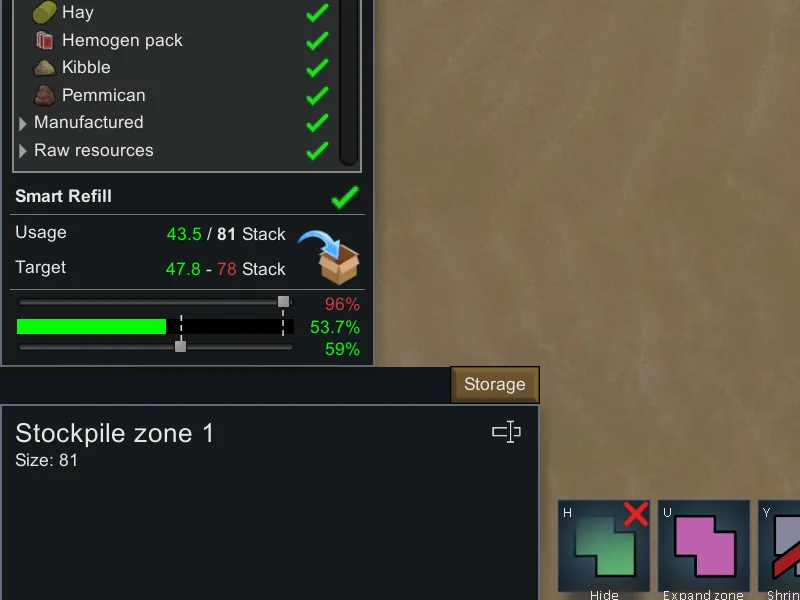 Also, for colonist work efficiency, this mod does not hard stop any colonist who is [i]already[/i] on the way to delivery things to the storage. So they will finish whatever they are [i]already[/i] hauling into the storage before the refill stop. (If you think about it, there is no point to hard stop at the upper limit, because that only wastes storage space and waste some of the ongoing work efforts)