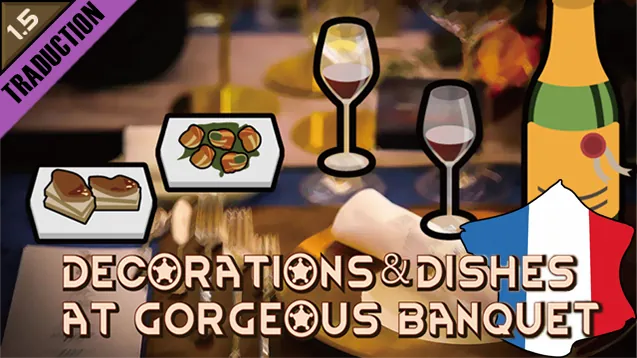Traduction française du mod : [b] Decorations and dishes at Gorgeous banquet [/b] La nourriture et les décorations luxueuses du magnifique banquet, ainsi qu'une robe de soirée.