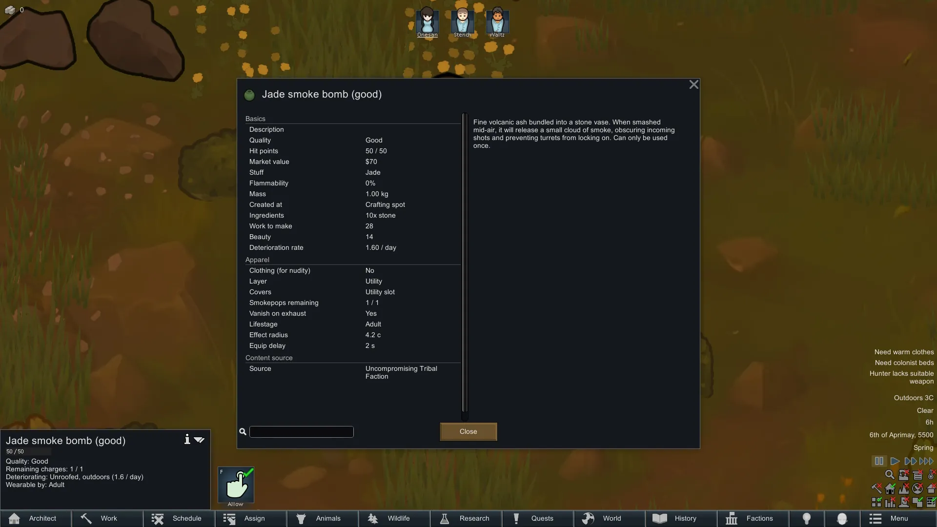 A very simple retexture for the smoke bombs from the Uncompromising Tribals mod. It's a bit simpler, I will admit, but it does correctly show you the material its made out of now, unlike the previous sprite which would be tinted but was not designed with it in mind. I also made a quick patch to update the description of the item to reflect this sprite change.