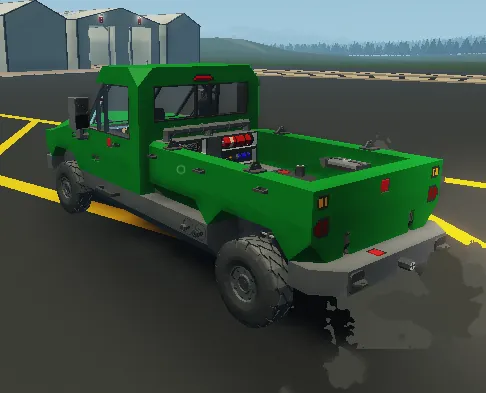 Stock Pickup truck with fire extinguisher, welder, med kit, flashlight/binoculars, and flare.