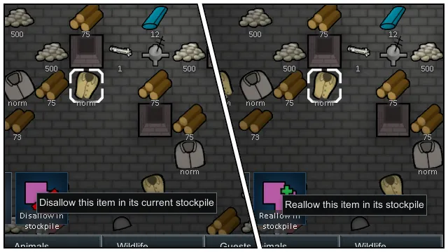 • Selecting an item already in a stockpile gives a command to let you disallow it in that stockpile