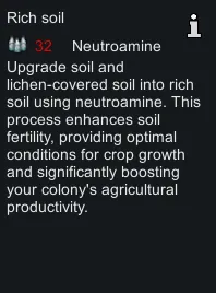 - Upgrade soil and lichen-covered soil into rich soil using neutroamine.