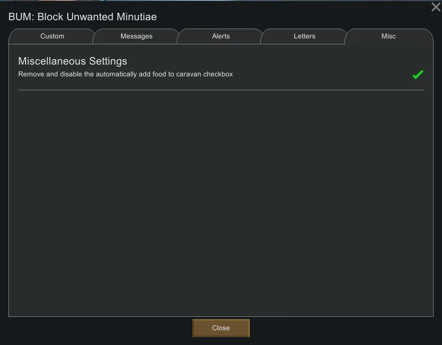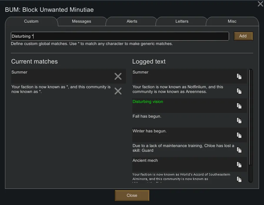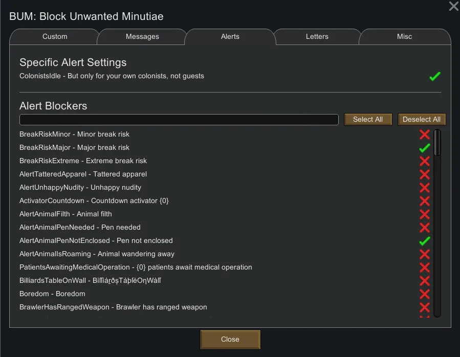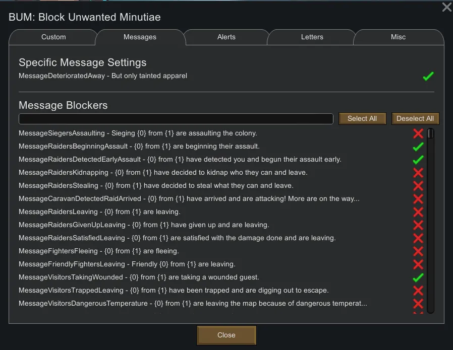 This mod blocks some unwanted messages, alerts, letters, and misc features that Rimworld has, with mod settings enabled so you can toggle off any you don't want blocked.