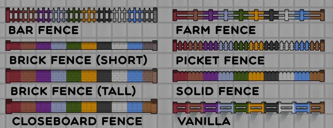 Documentation from the original mod, which is located [url=https://steamcommunity.com/sharedfiles/filedetails/?id=2050680665]here[/url], is still largely correct. If you find yourself missing the configuration menu that let you set all the stats on the fences, check out Mlie's version of this mod under the name [url=https://steamcommunity.com/sharedfiles/filedetails/?id=2576081324]Architect Expanded - Fences (Continued)[/url].