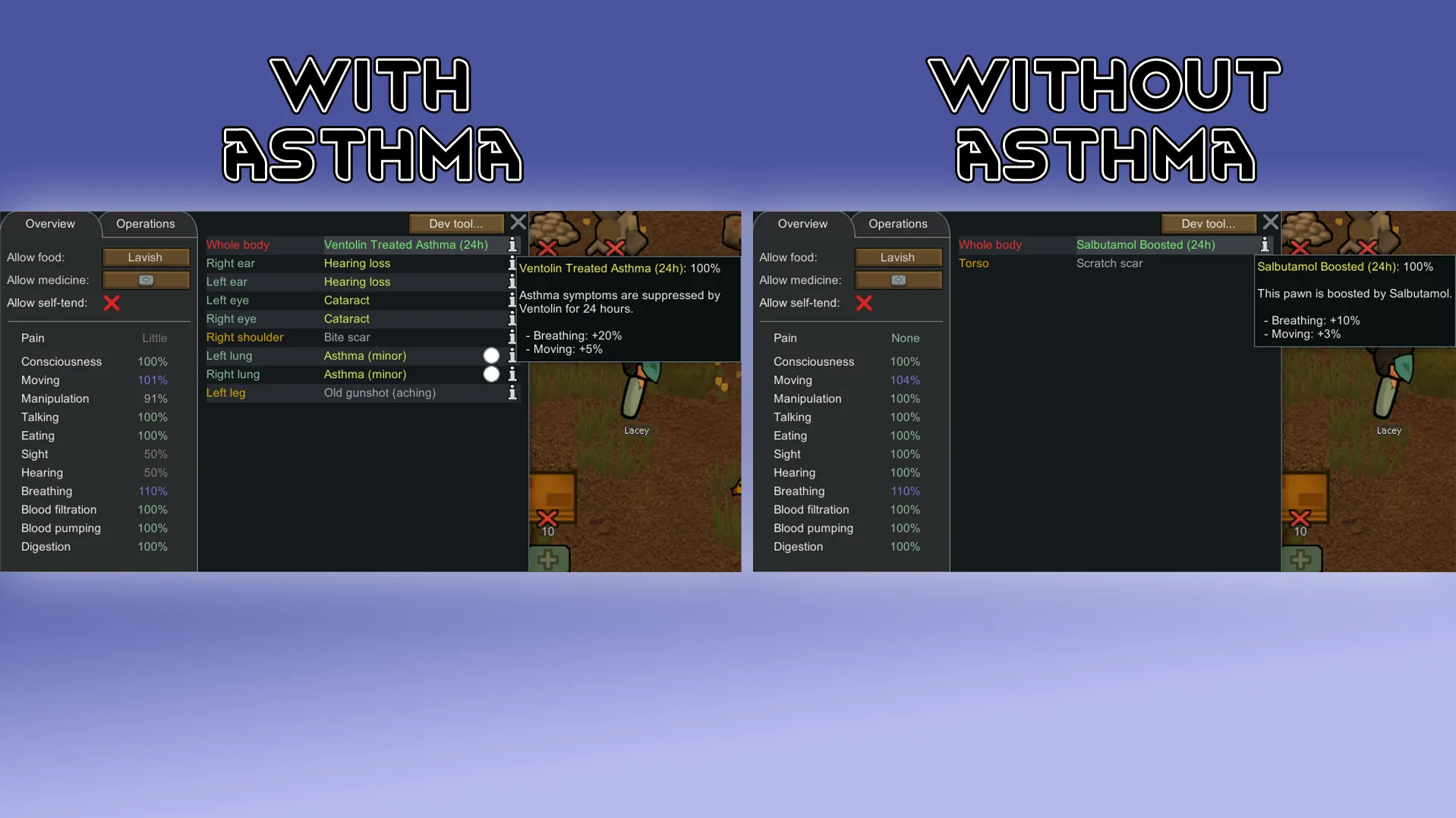 This mod adds a ventolin item that helps pawns with asthma. textures made by: neonoxia