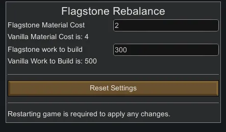 Reduces the cost and construction time for all the Flagstone (included modded). Includes a Settings Menu for adjusting these values to suit your preferences.