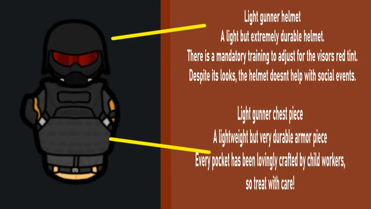Democracy has finally arrived on the Rim. Too long has tyranny, undemocratic thoughts and destruction of voting booths run rampant. Now its time for democracy to preemptively strike back. Liberate those that stand in the way of global freedom with the power of these armor sets solely built to protect the warriors of democracy and strike fear into the hearts of tyrants! For voting booths! For freedom! For democracy and for super Rimworld!