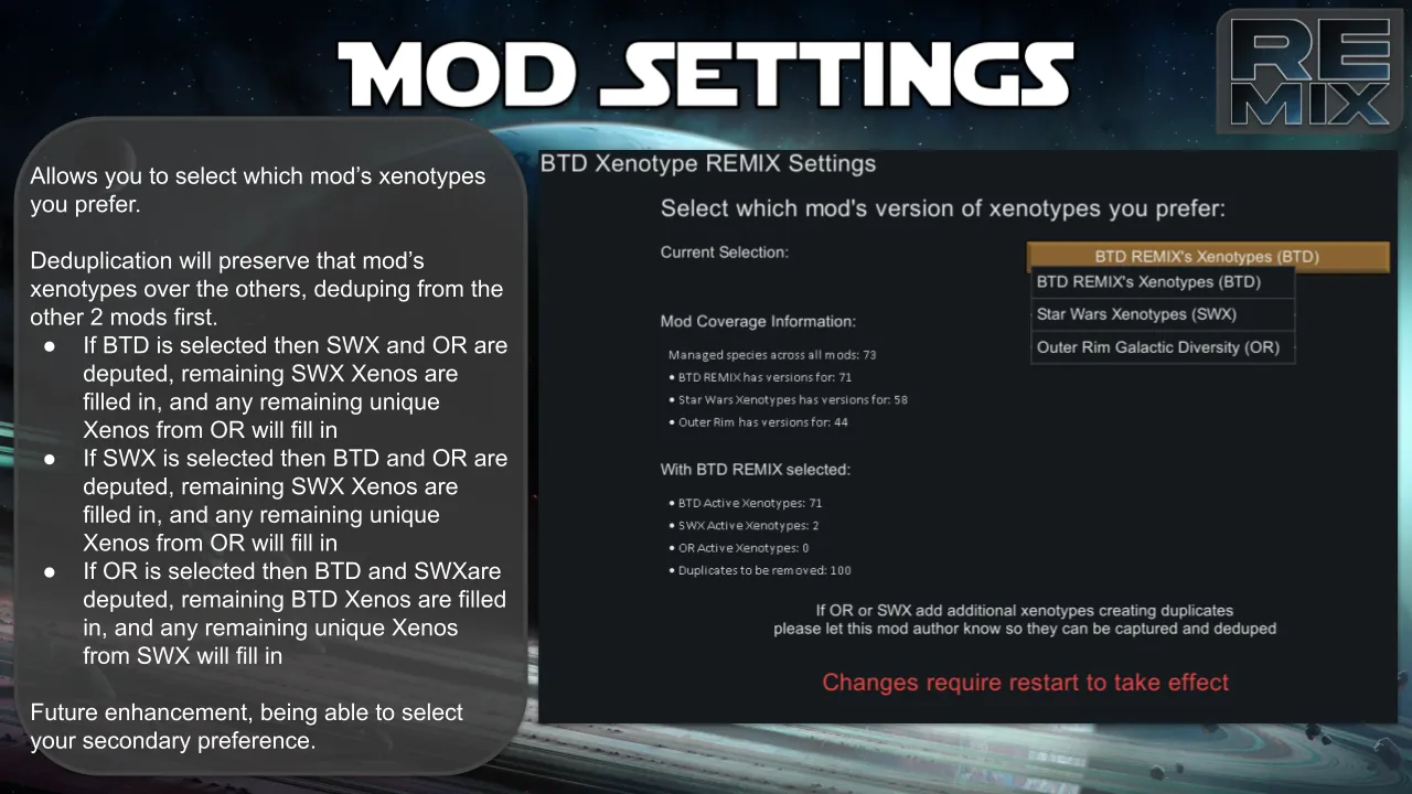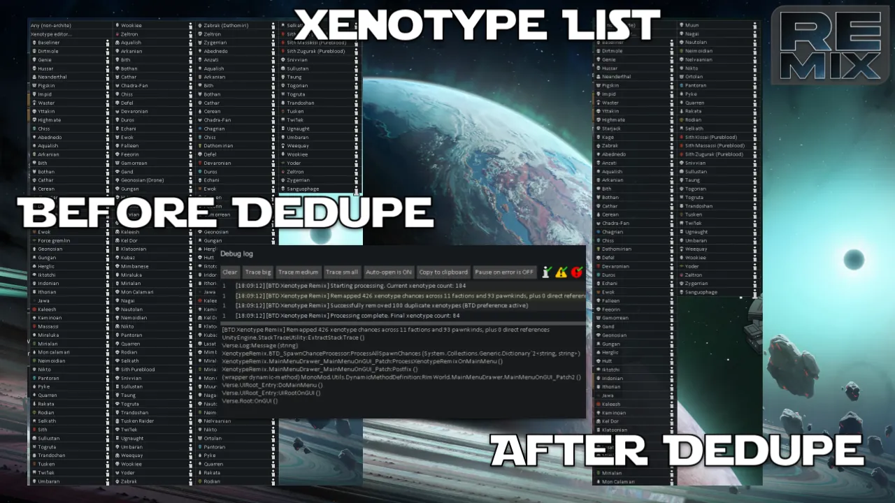 A patch mod that adds custom Star Wars Xenotypes using the [b][url=https://steamcommunity.com/sharedfiles/filedetails/?id=2915192253]Star Wars Xenoptypes[/url][/b] (SWX) and [b][url=https://steamcommunity.com/sharedfiles/filedetails/?id=2980427615]Outer Rim - Galactic Diversity[/url][/b] (OR) mods, and then deduplicates xenotypes so you don't have 3 different versions of Twi'leks appearing in your game.