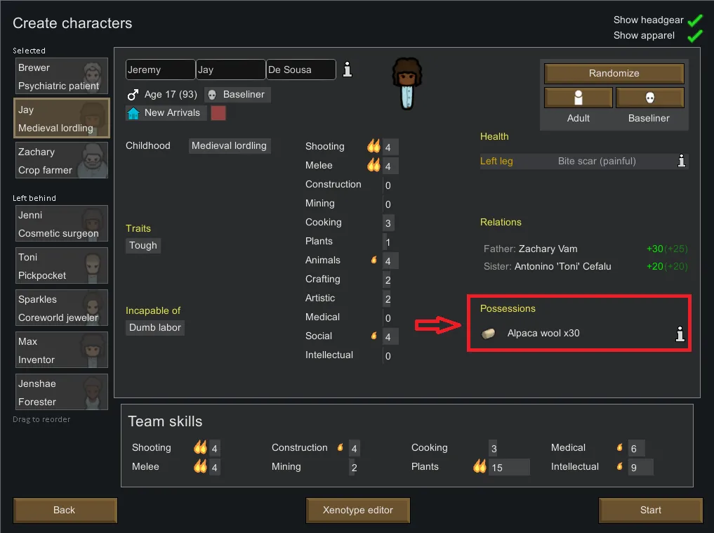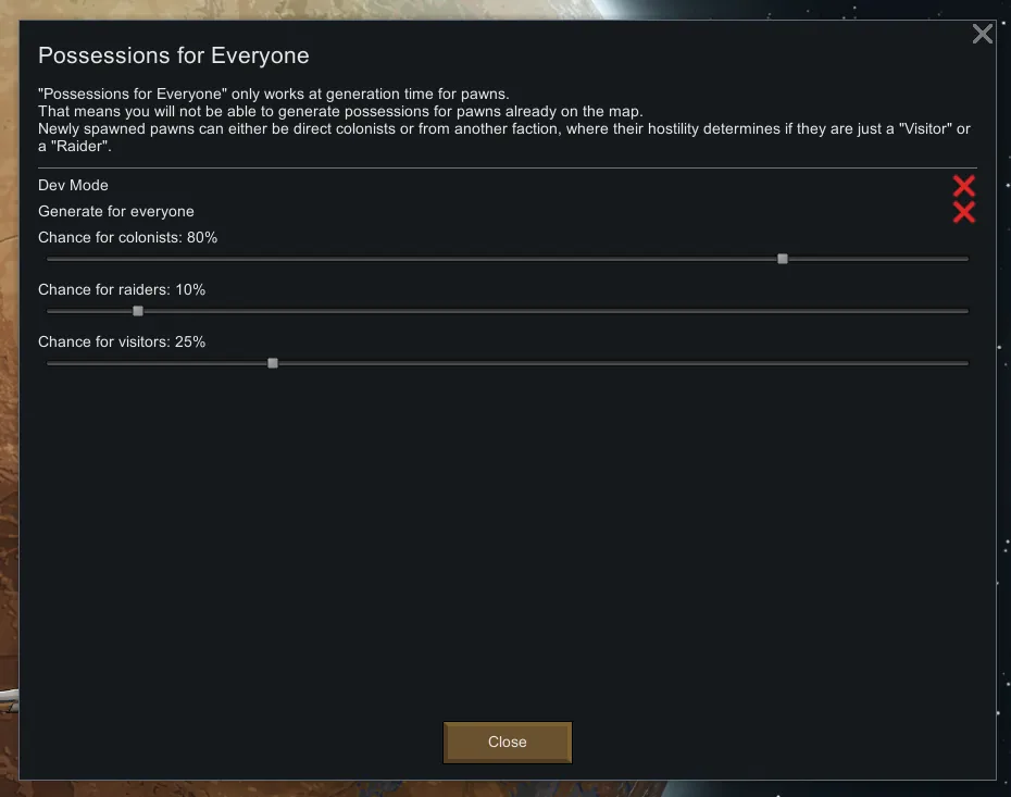 Allows all pawns to generate with possessions in their inventory. This includes visitors and raiders! You can configure the chance that either of these groups has possessions in the mod settings.