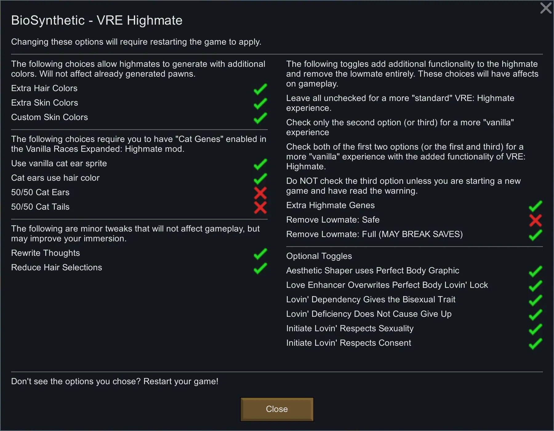 Depending on what options you select, it can add new skin/hair color options, prevent lovin' dependent pawns from leaving the colony and instead make them isolate when that need is not satisfied, let the Aesthetic Shaper function graphically as the Perfect Body gene, let the Love Enhancer bypass the restrictions of Perfect Body Gene, give the new genes added by VRE: Highmate to the Highmate xenotype, remove the Lowmate xenotype (in a safe, compatible way, or fully if you like to live dangerously, I'm not your mom), and have catgirl (or boy) Highmates without every Highmate being a catgirl (or boy).