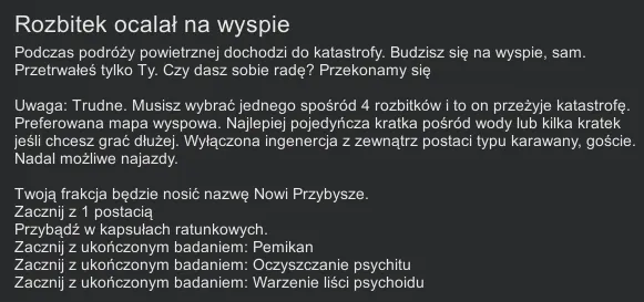 Uwaga: Trudne. Musisz wybrać jednego spośród 4 rozbitków i to on przeżyje katastrofę. Preferowana mapa wyspowa. Najlepiej pojedyńcza kratka pośród wody lub kilka kratek jeśli chcesz grać dłużej. Wyłączona ingenercja z zewnątrz postaci typu karawany, goście. Nadal możliwe najazdy.