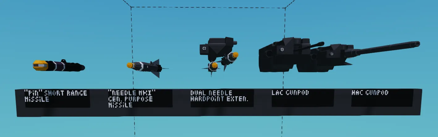 Payloads for designated for my vehicles - "pin" short range missiles - "Needle MK1" general purpose missile - Dual needle launcher hardpoint extension - Light AC gunpod - Heavy AC gunpod