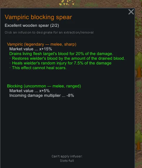 - Click an equipment with the infusion you want. Open [i]Infusions[/i] tab. [b]Click the infusion in the list[/b]. It should be highlighted with a yellow background. One of your crafting colonist will extract it when they can. (You need an empty infuser)