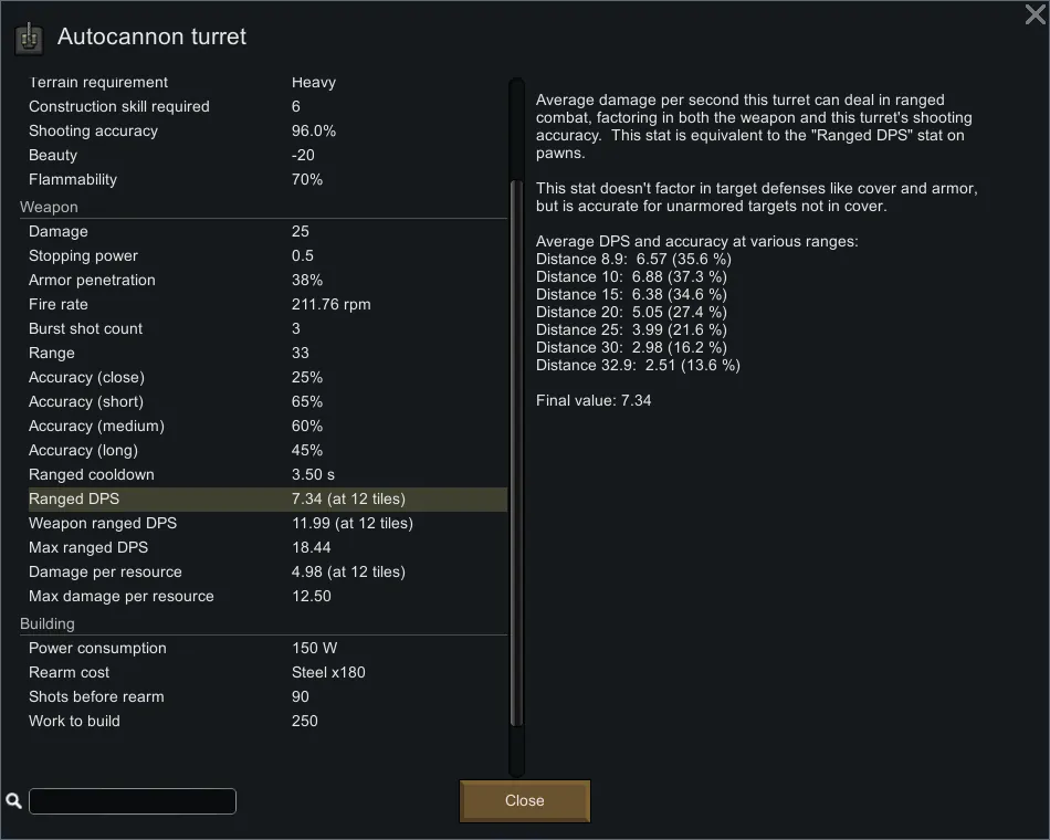 This stat is the equivalent to "Ranged DPS" for pawns. It represents the DPS this turret can achieve, factoring in both the inherent accuracy of the turret's weapon and the shooting accuracy of the turret mount. This is the most accurate DPS stat available and is the one you should use when trying to see how effective this turret is, or how it compares to a pawn's Ranged DPS.