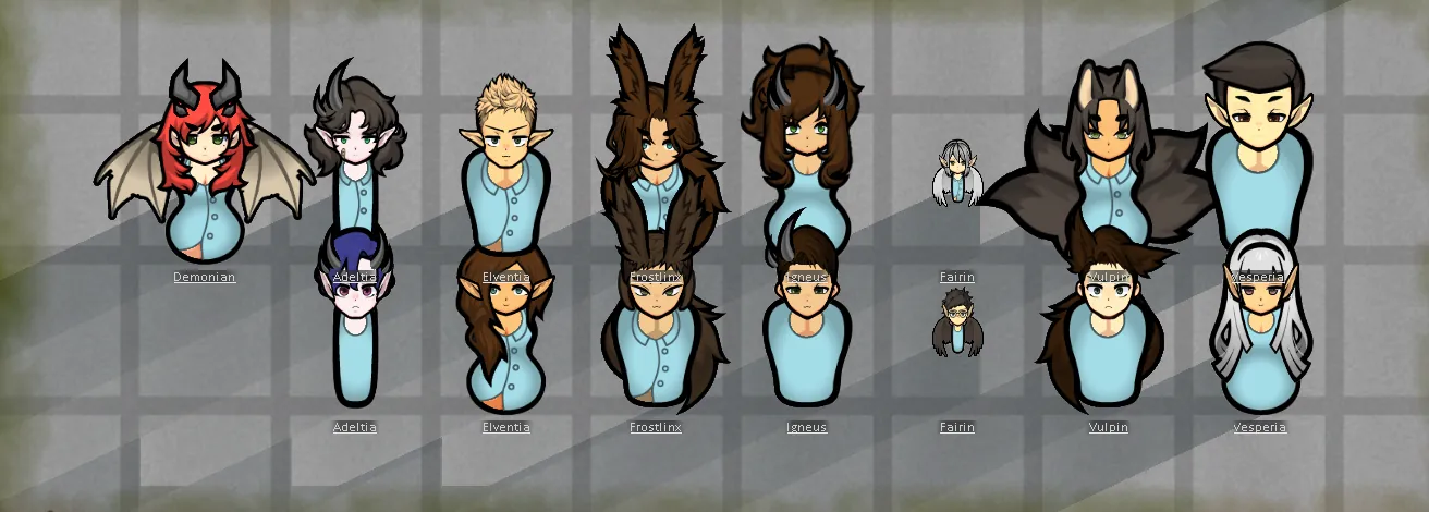 Vulpin - a foxgirl race, can randomly spawn with nine-tail. good at Art, Medicine, and Social