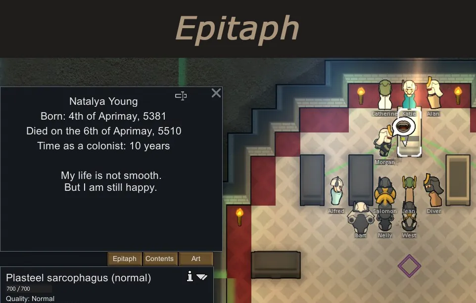Most of them are quoted from poems, lyrics, inscriptions, last words, wide spread epitaphs etc. I just collect them, of course I do write, rephrase and adjust a lot to make it fit in Rimworld style. Hope you enjoy the charm of the tragedy.
