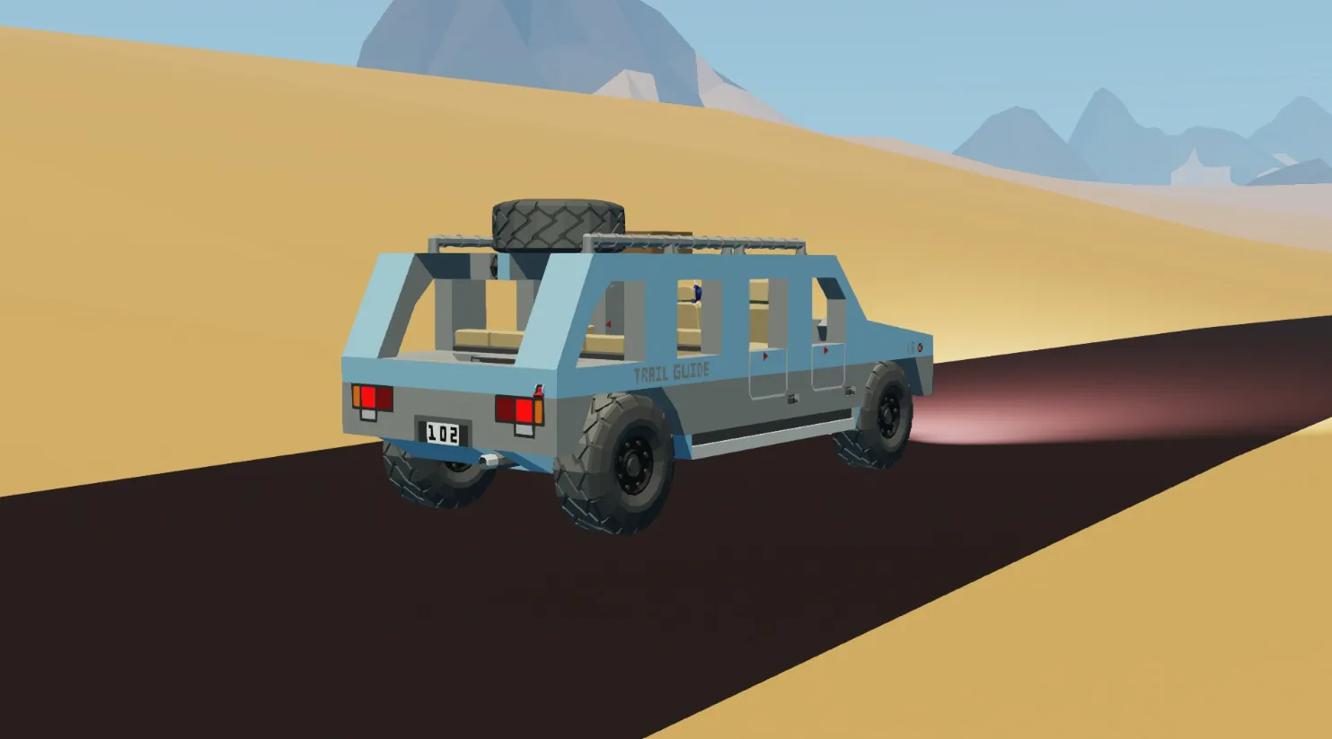 Powered by a naturally aspirated 6 cylinder engine, and 5 speed manual transmission, with a top speed of 120 mph, we bring you the Trail Guide. An offroad suv. With 4 doors and 9 seats, this vehicle is perfect for family travel. Welding torch and fire extinguisher can be found in the trunk.