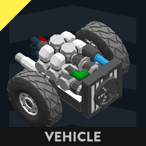 8 cyl truck engine designed with cavity for wheels, allowing for the engine to only be 2 blocks above the wheels. This engine is turbo-charged and uses the in-game starter, pump, and alternator, making this engine a far simpler and easier engine to implement.