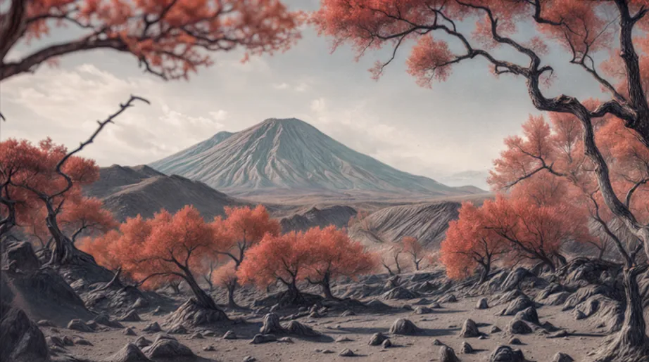 Вулканическая пустыня: бесплодная равнина, покрытая обсидианом и застывшей лавой. Недалеко расположено несколько вулканов, которые угрожающе бурлят. На редких островках почвы виднеется несколько тощих деревьев.