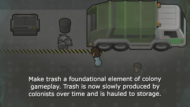 This aims to make trash and waste management a more fundamental gameplay element to Rimworld. This mod adds a configurable tally to each colonist which goes up when they clean filth. When they reach the set maximum, by default 50, they will wrap the trash up into a trash bag and haul it to storage.