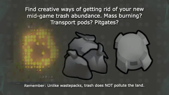 - [url=https://steamcommunity.com/sharedfiles/filedetails/?id=3265385154]Burn Trash[/url], a companion mod inspired by Trash Mod that lets you cremate trash. Note that this does not emit toxgas, which kinda messes with balancing