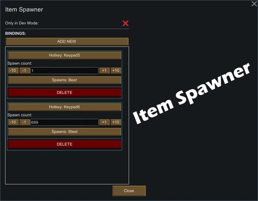 Allows you to spawn any item in any amount using custom hotkeys. That is all :)