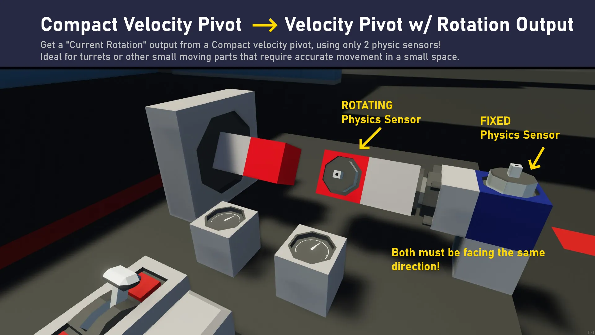 Uses 2 physics sensors to get the "Current Rotation" output of a Velocity Pivot. Best used with Compact Velocity Pivots to measure their turns.