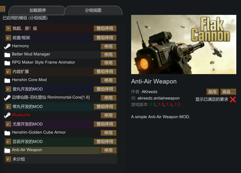 支持两种视图切换:加载顺序视图按启用顺序显示模组,分组视图按分组折叠展示。均可拖拽调整顺序或启用/禁用。