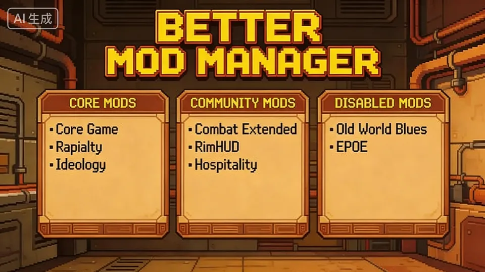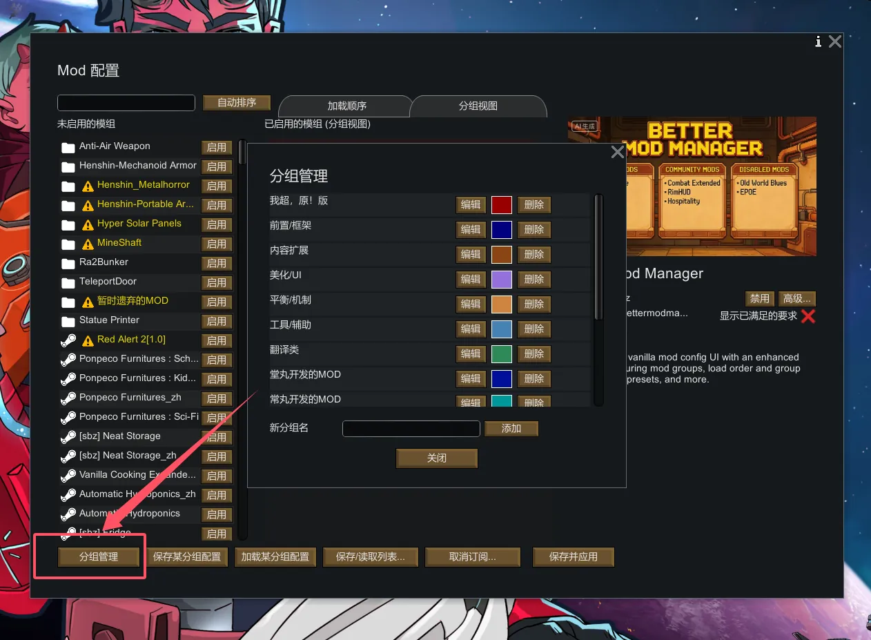 增强版模组配置界面,替换原版模组设置页面,提供分组管理视图、预设保存等功能。