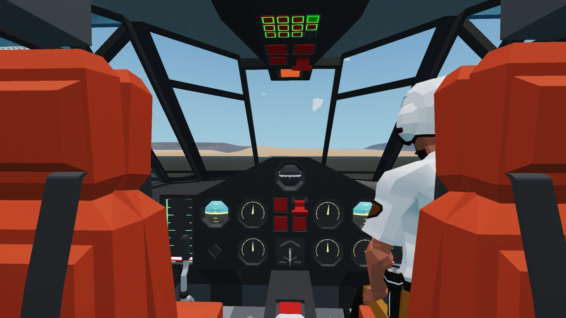 To start the helicopter, turn on the key and increase the throttle to 100%. Once the engine spools up, turn off the parking brake and apply forward pitch to taxi the helicopter out. Once out the hangar, apply collective climb or descend (if already in the air). You can toggle the landing gear by flipping the switch in the center console. The pilot's seat controls aircraft flight and can also control the searchlight. The co-pilot's seat only controls the search light. The parking brake is on the ceiling along with all navigation lights and landing lights. The searchlight and heater buttons are found behind the throttle, and the autopilot, altitude hold, and landing gear buttons are on the center console. The keypads for autopilot and altitude hold are located on the ceiling.