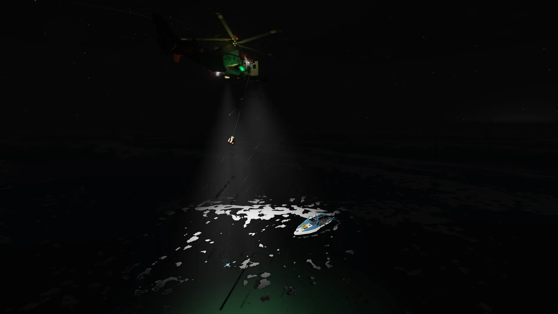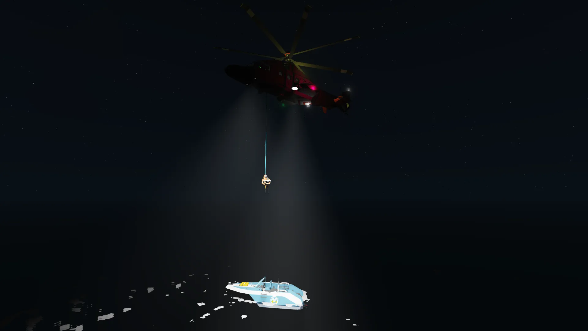 To operate the winch, first open the door by pressing the button found on the control panel on the left wall. Then press the button that moves the winch outside. Raising and lowering the winch can be controlled by both the control panel and the master harness (if playing solo). If you are in the master winch and need to get back into the helicopter, grab one of the multiple handles that are around the door frame, exit the winch, and then try to get in a seat.