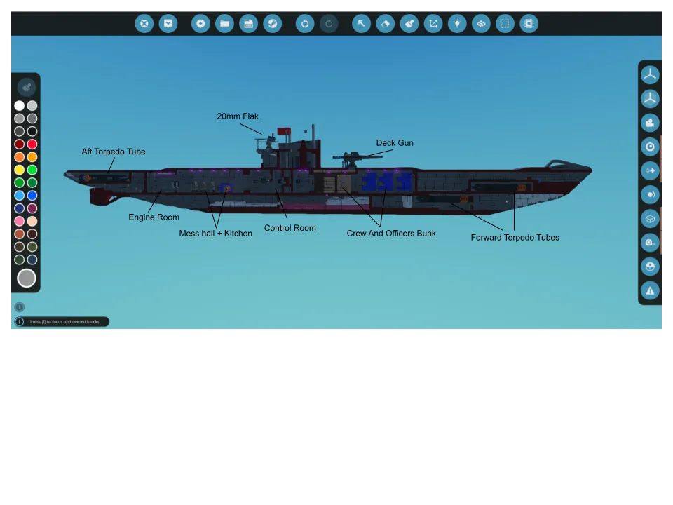 Also I did swap out the torpedoes for much faster ones, and I did put an experimental reloading feature that I plan on improving on. (Note that the reloading feature is highly experimental. And it would rarely work.