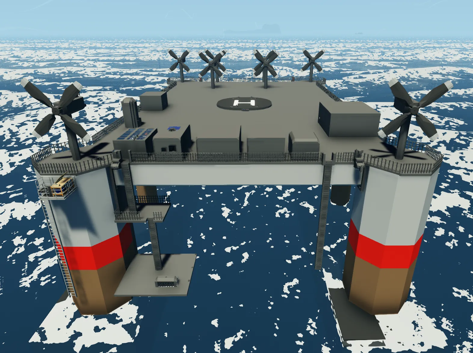 it has a bathroom and 1 building where there is one 1 bed and a small kitcken aswell as 1 other building with just beds and also a storage building and a extra battery building and also a workshop which is not done yet and a heli pad and a dock Which is not really meant to be docked at during Heavy storms but if you are already docked it should maybe be fine.