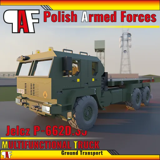 [b]JELCZ P662D.35 [/b]type chassis is 3-axle, all-wheel- drive (6×6), high-mobility special vehicle used in [b]Polish Armed Forces[/b]. The chassis is assigned to transport military substructures and hardware. In this version it is equipped with undercointainer frame for transportation 20ft ISO container and STANAG 4569 1 standard armored cab with 4 places. It's 3-axle chassis provides best performance offroad and on road.