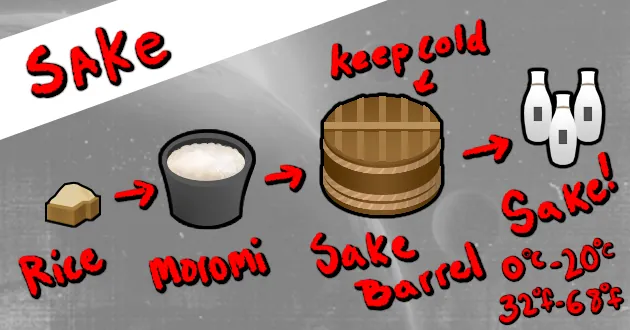 Sake & Sake Brewing (Requires brewing table to turn rice into Moromi. Sake is fermented in cool storage 0c-20c / 32f-68f)