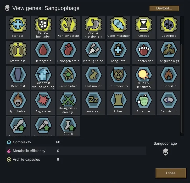 Can be used on existing saves. Already spawned Sanguophages will not have the new gene. To fix this, activate Development mode and use the action Set Xenotype once for Baseliner and again for Sanguophage.